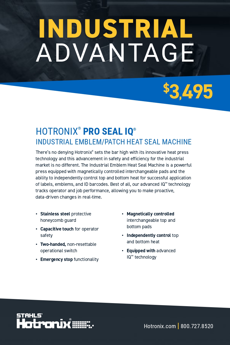 Hotronix® quality, IQ® technology now for the industrial market. The Industrial Emblem Heat Seal Machine is a powerful press designed for successful application of labels, emblems, and ID barcodes. Advanced IQ™ technology tracks operator and job performance, allowing you to make proactive, data-driven changes in real-time to increase efficiency across your workforce.